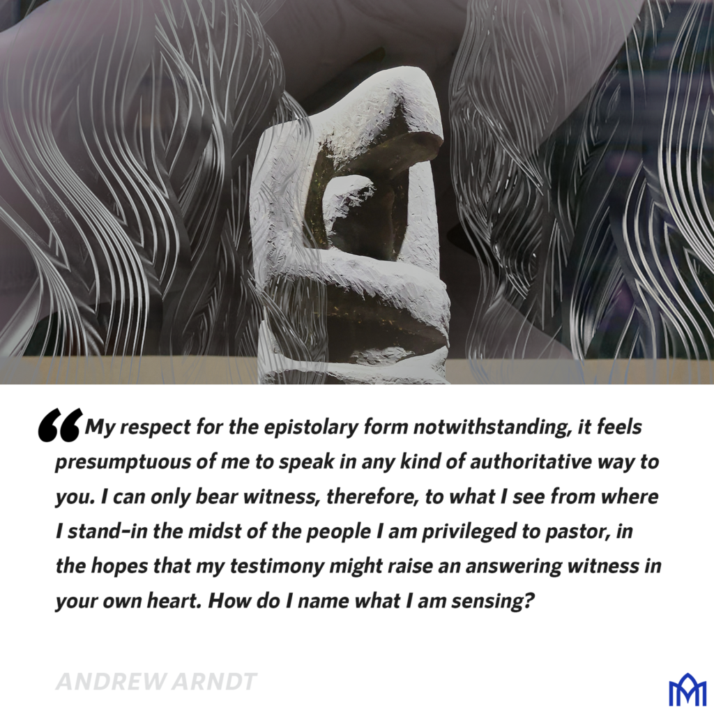 "My respect for the epistolary form notwithstanding, it feels presumptuous of me to speak in any kind of authoritative way to you. I can only bear witness, therefore, to what I see from where I stand–in the midst of the people I am privileged to pastor, in the hopes that my testimony might raise an answering witness in your own heart. How do I name what I am sensing?"
