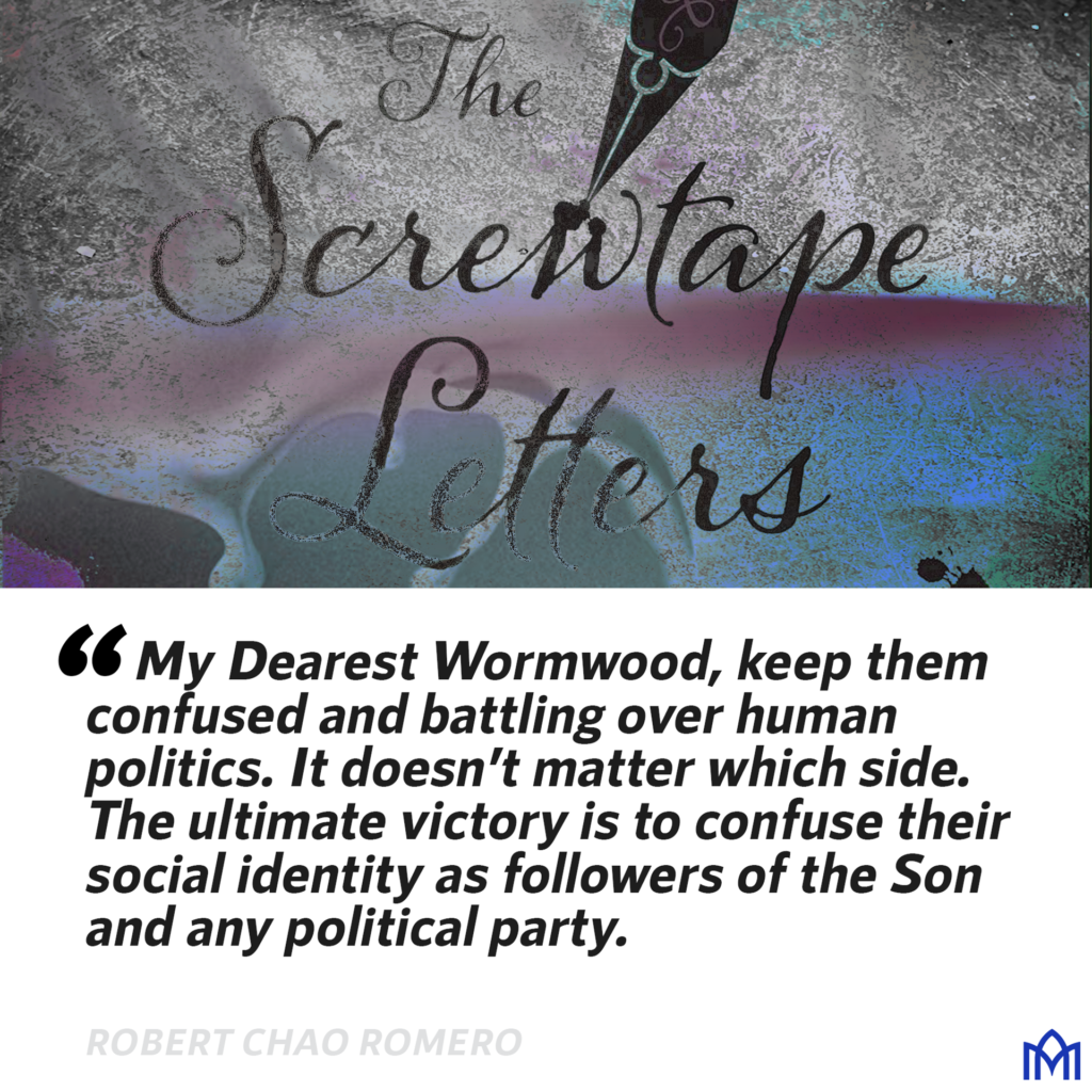 Finally, my dearest Wormwood, keep them confused and battling over human politics. It doesn’t matter which side. The ultimate victory is to confuse their social identity as followers of the Son and any political party.