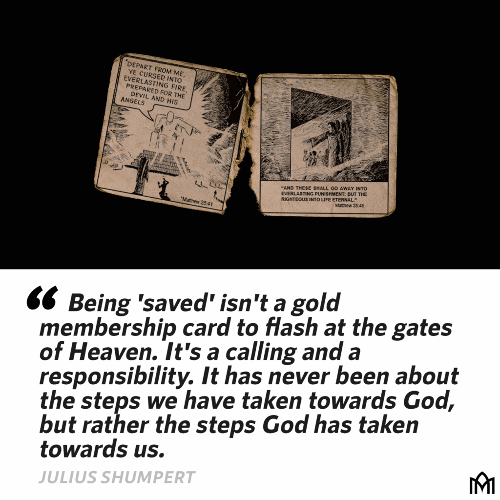 Paul writes in Colossians 1:21 that we were once “alienated… in our minds,” but now we’ve been reconciled. That reconciliation isn’t merely a status symbol. It’s an invitation. We’re invited to be part of the healing of the world. Being “saved” isn’t a gold membership card to flash at the gates of heaven. It’s a calling and a responsibility. Salvation is rooted in our ability to trust the foundation of reality itself, not on our own strength or will-power. It has never been about the steps we have taken towards God, but rather the steps God has taken towards us.